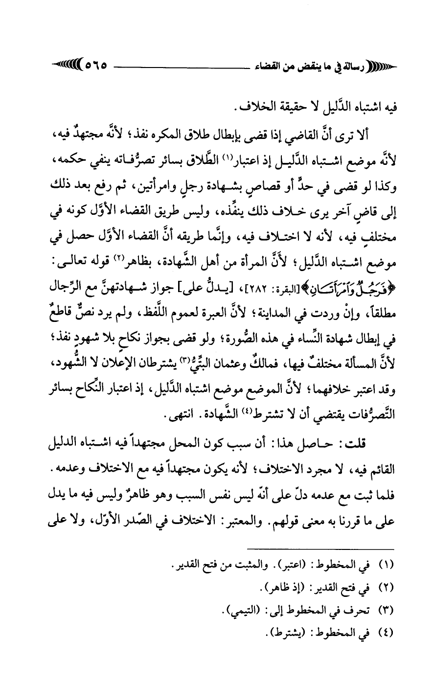 ألا ترى أنَّ القاضي إذا قضى بإبطال طلاق المكره نفذ؛ لأنَّه مجتهدٌ فيه، لأنَّه موضع اشتباه الدَّليل إذ اعتبار (¬1) الطَّلاق بسائر تصرُّفاته ينفي حكمه، وكذا لو قضى في حدٍّ أو قصاصٍ بشهادة رجلٍ وامرأتين، ثم رفع بعد ذلك إلى قاضٍ آخر يرى خلف ذلك ينفِّذه، وليس طريق القضاء الأوَّل كونه في مختلفٍ فيه، لأنه لا اختلاف فيه، وإنَّما طريقه أنَّ القضاء الأوَّل حصل في موضع اشتباه الدَّليل؛ لأَنَّ المرأة من أهل الشَّهادة، بظاهر (¬2) قوله تعالى: {فَرَجُلٌ وَامْرَأَتَانِ} [البقرة: 282]، [يدكُ على] جواز شهادتهنَّ مع الرِّجال مطلقاً، وإنْ وردت في المداينة؛ لأنَّ العبرة لعموم اللَّفظ، ولم يرد نصُّ قاطع في إبطال شهادة النِّساء في هذه الصُّورة؛ ولو قضى بجواز نكاحٍ بلا شهودٍ نفذ؛ لأنَّ المسألة مختلفٌ فيها، فمالكٌ وعثمان البتِّيُّ (¬3) يشترطان الإعلان لا الشُّهود، وقد اعتبر خلافهما؛ لأنَّ الموضع موضع اشتباه الدَّليل، إذ اعتبار النكاح بسائر التَّصرُّفات يقتضي أن لا تشترط (¬4) الشَّهادة. انتهى.