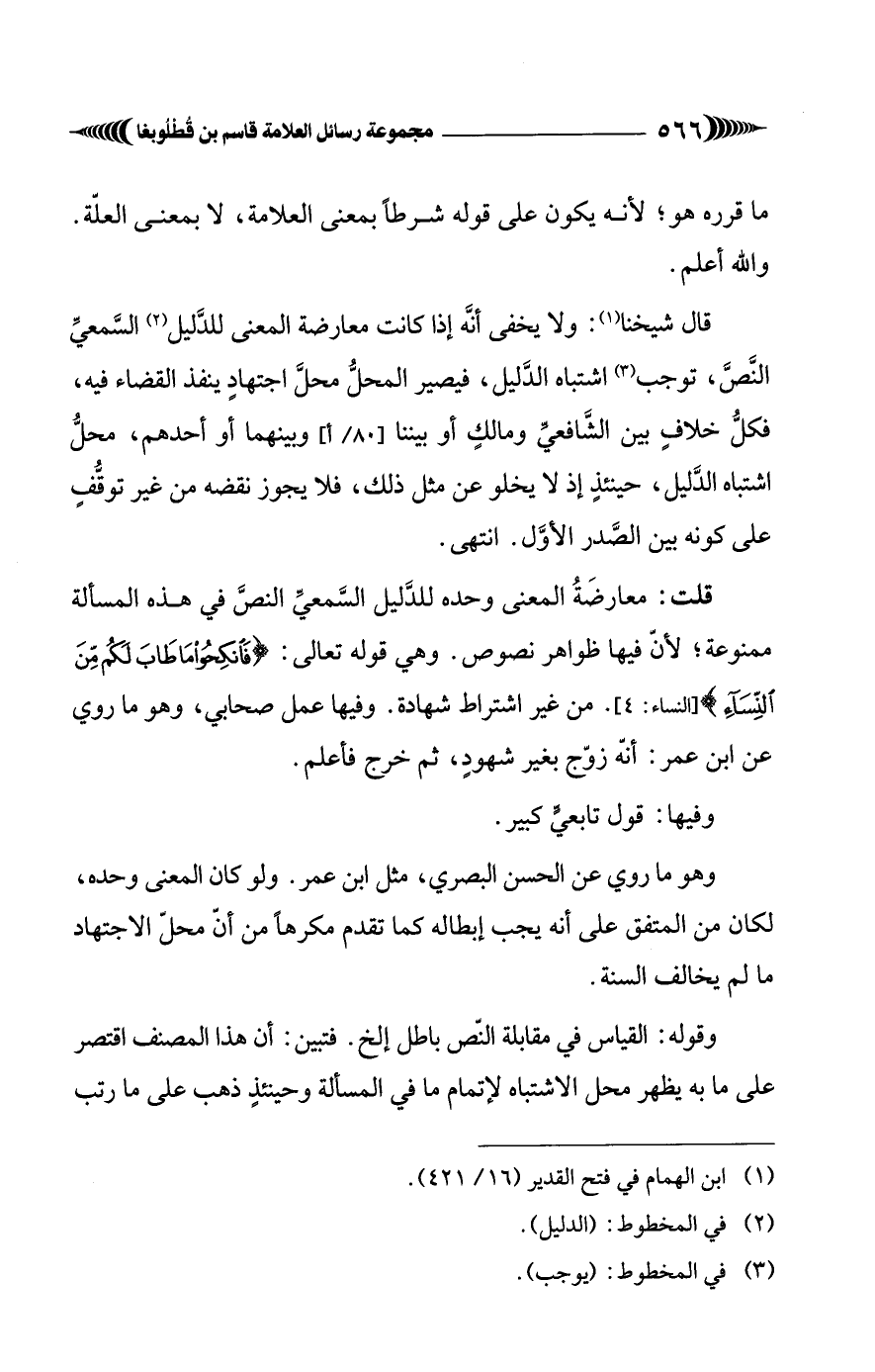 قلت: معارضَةُ المعنى وحده للدَّليل السَّمعيِّ النصَّ في هذه المسألة ممنوعة؛ لأنّ فيها ظواهر نصوص. وهي قوله تعالى: {فَانْكِحُوا مَا طَابَ لَكُمْ مِنَ النِّسَاءِ} [النساء: 3]. من غير اشتراط شهادة. وفيها عمل صحابي، وهو ما روي عن ابن عمر: أنّه زوّج بغير شهودٍ، ثم خرج فأعلم.
