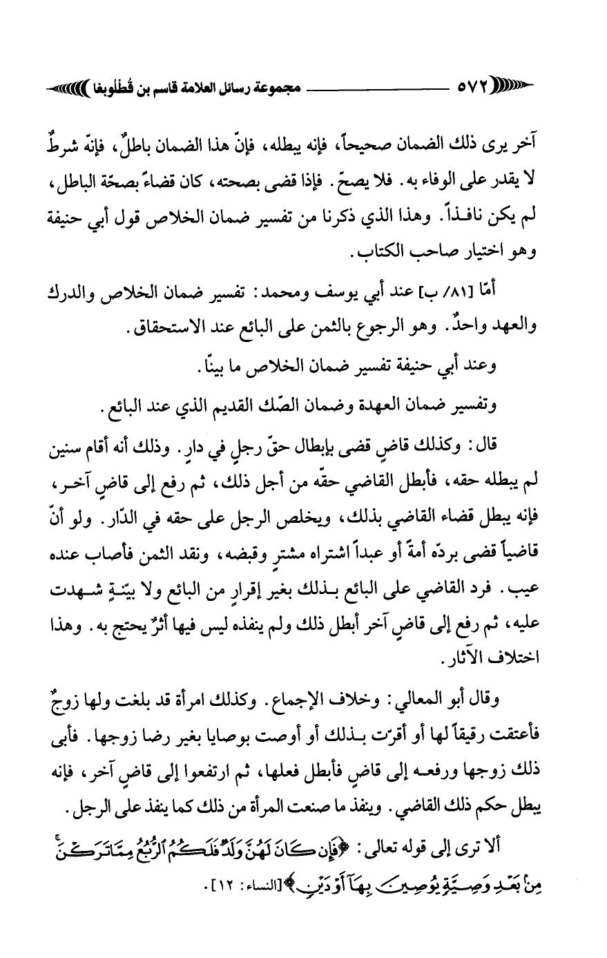 آخر يرى ذلك الضمان صحيحاً، فإنه يبطله، فإنّ هذا الضمان باطلٌ، فإنَّه شرطٌ لا يقدر على الوفاء به. فلا يصحّ. فإذا قضى بصحته، كان قضاءً بصحّة الباطل، لم يكن نافذاً. وهذا الذي ذكرنا من تفسير ضمان الخلاص قول أبي حنيفة وهو اختيار صاحب الكتاب.