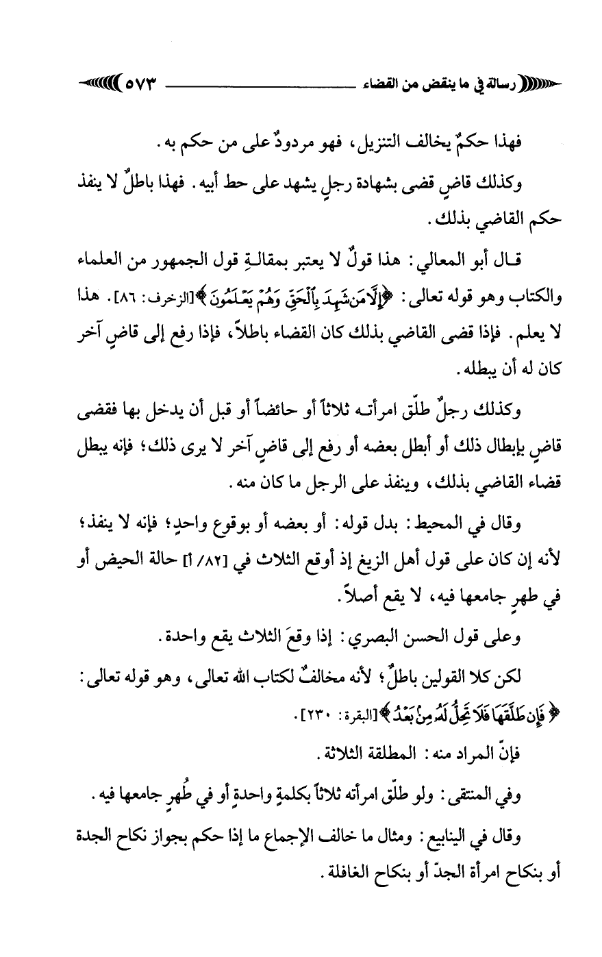 وكذلك رجلٌ طلّق امرأته ثلاثاً أو حائضاً أو قبل أن يدخل بها فقضى قاضٍ بإبطال ذلك أو أبطل بعضه أو رفع إلى قاضٍ آخر لا يرى ذلك؛ فإنه يبطل قضاء القاضي بذلك، وينفذ على الرجل ما كان منه.
