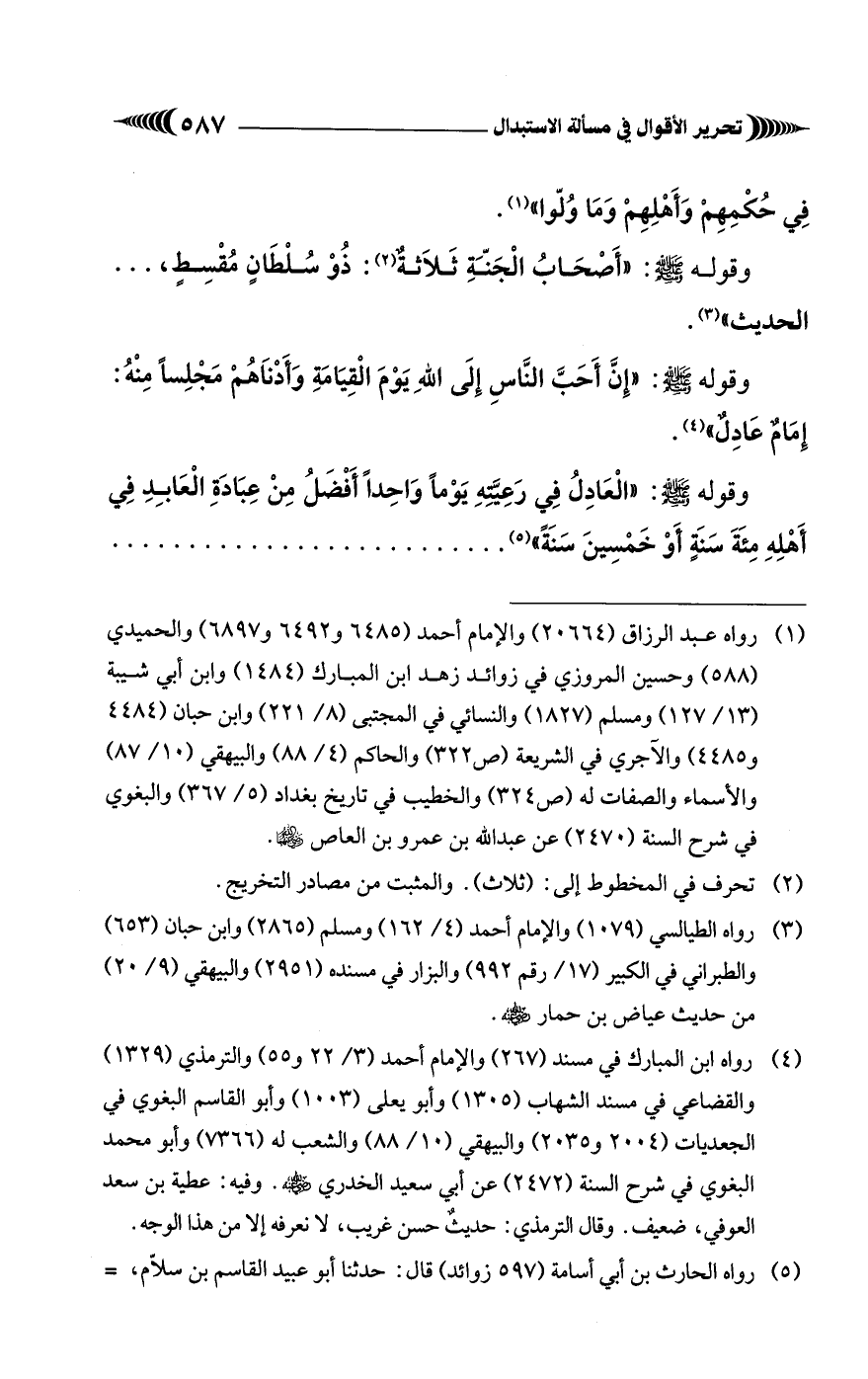 (¬1) رواه عبد الرزاق (20664) والإمام أحمد (6485 و 6492 و 6897) والحميدي (588) وحسين المروزي في زوائد زهد ابن المبارك (1484) وابن أبي شيبة (13/ 127) ومسلم (1827) والنسائي في المجتبى (8/ 221) وابن حبان (4484 و 4485) والآجري في الشريعة (ص 322) والحاكم (4/ 88) والبيهقي (10/ 87) والأسماء والصفات له (ص 324) والخطيب في تاريخ بغداد (5/ 367) والبغوي في شرح السنة (2470) عن عبد الله بن عمرو بن العاص - رضي الله عنه -.