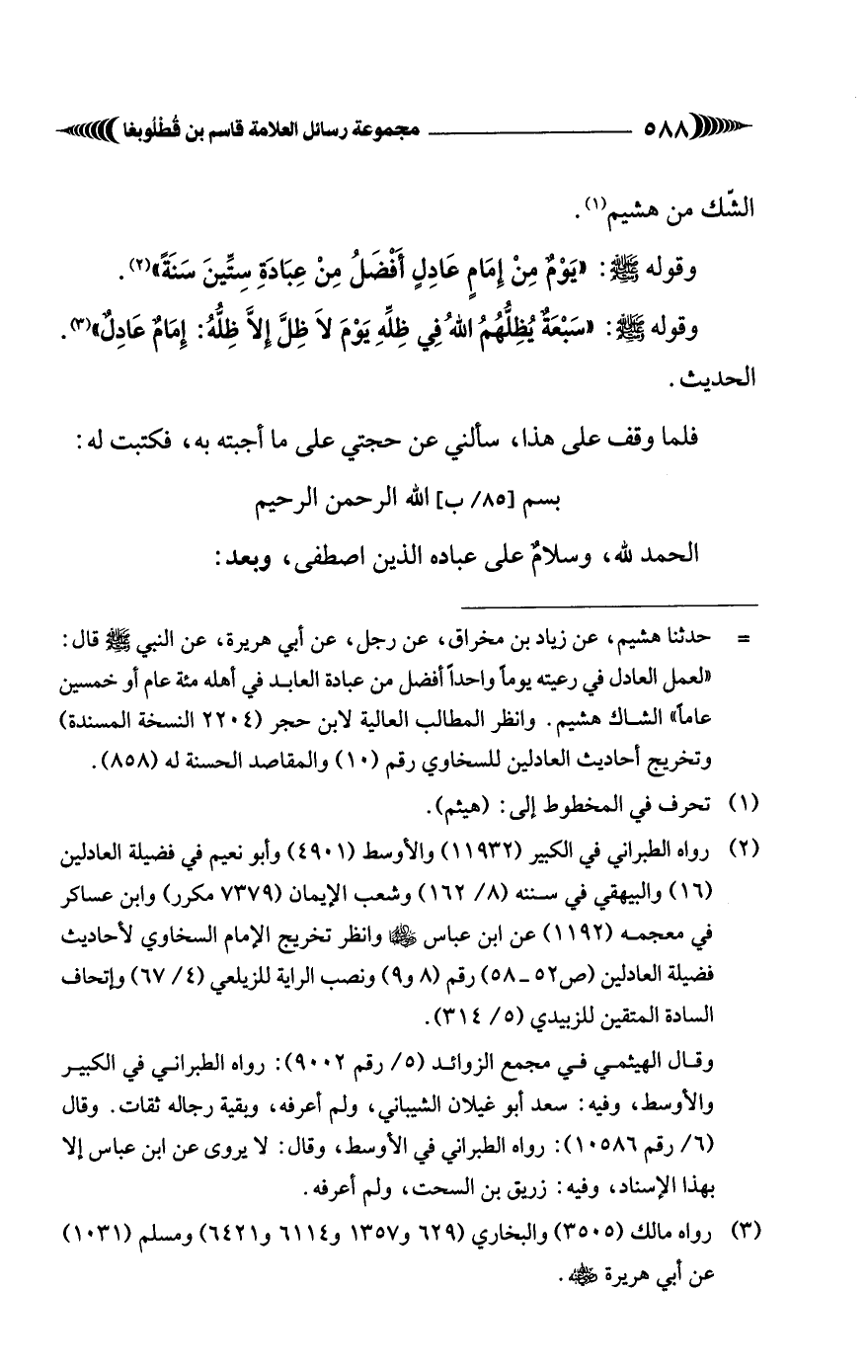 (¬2) رواه الطبراني في الكبير (11932) والأوسط (4901) وأبو نعيم في فضيلة العادلين (16) والبيهقي في سننه (8/ 162) وشعب الإيمان (7379 مكرر) وابن عساكر في معجمه (1192) عن ابن عباس - رضي الله عنهما - وانظر تخريج الإمام السخاوي لأحاديث فضيلة العادلين (ص 52 - 58) رقم (8 و 9) ونصب الراية للزيلعي (4/ 67) وإتحاف السادة المتقين للزبيدي (5/ 314).