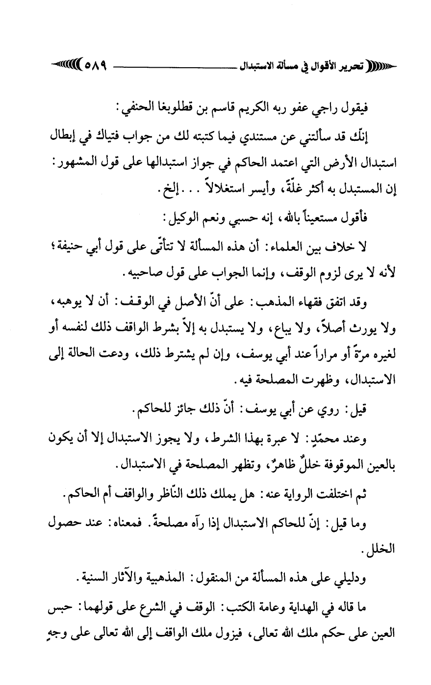 إنّك قد سألتني عن مستندي فيما كتبته لك من جواب فتياك في إبطال استبدال الأرض التي اعتمد الحاكم في جواز استبدالها على قول المشهور: إن المستبدل به أكثر غلّةً، وأيسر استغلالاً. . . إلخ.