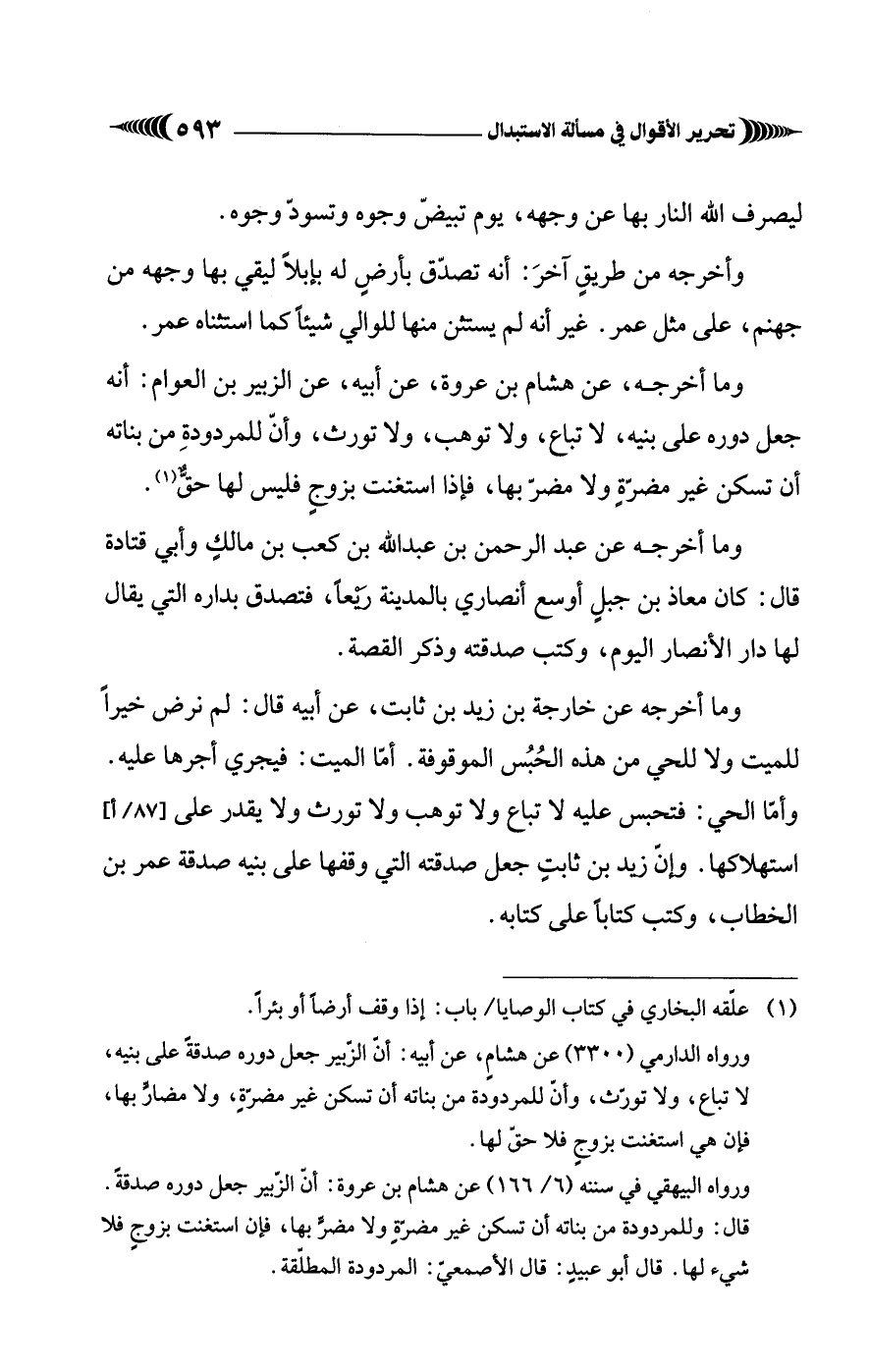 ورواه البيهقي في سننه (6/ 166) عن هشام بن عروة: أن الزّبير جعل دوره صدقةً. قال: وللمردودة من بناته أن تسكن غير مضرةٍ ولا مضرٍّ بها، فإن استغنت بزوجٍ فلا شيء لها. قال أبو عبيدٍ: قال الأصمعيُّ: المردودة المطلّقة.
