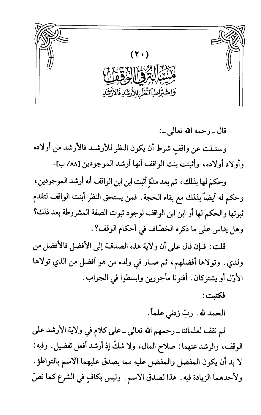 (20) مَسْأَلةٌ في الوَقْتِ وَاشْتِرَاطِ النَّظَرِ لِلأَرْشَدِ فَالأَرْشَدِ
