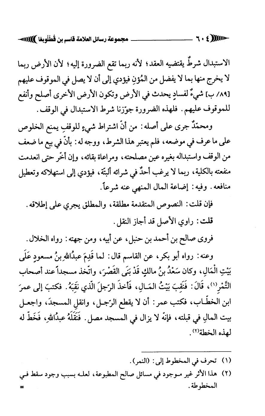 الاستبدال شرطٌ يقتضيه العقد؛ لأنه ريما تقع الضرورة إليه؛ لأن الأرض ريما لا يخرج منها بما لا يفضل من المُؤنِ فيؤدي إلى أن لا يصل في الموقوف عليهم شيءٌ لفسادٍ يحدث في الأرض وتكون الأرض الأخرى أصلح وأنفع للموقوف عليهم. فلهذه الضرورة جوّزنا شرط الاستبدال في الوقف.