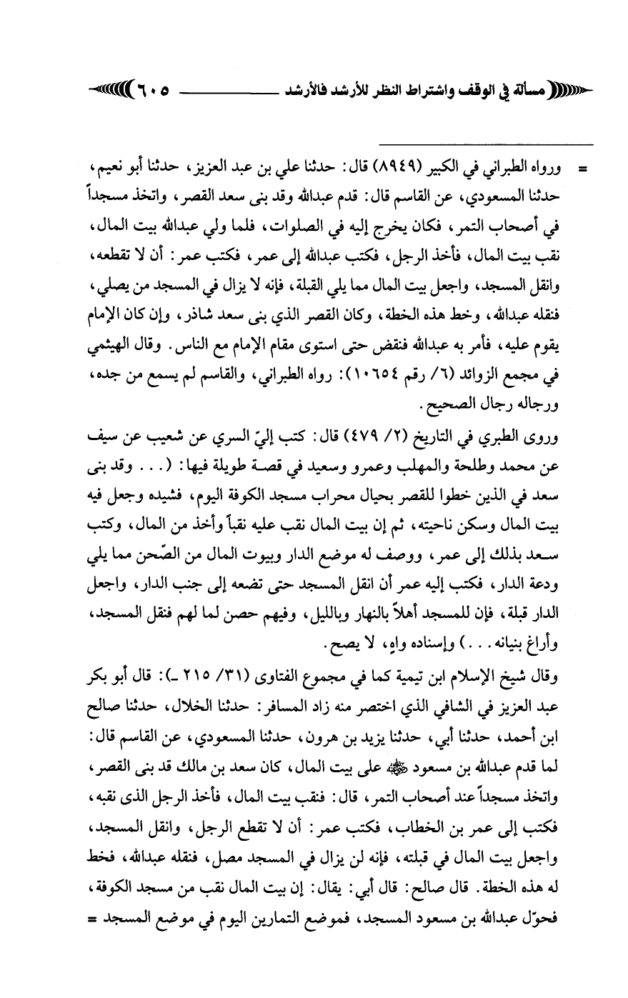 وقال شيخ الإسلام ابن تيمية كما في مجموع الفتاوى (31/ 215 -): قال أبو بكر عبد العزيز في الشافي الذي اختصر منه زاد المسافر: حدثنا الخلال، حدثنا صالح ابن أحمد، حدثنا أبي، حدثنا يزيد بن هارون، حدثنا المسعودي، عن القاسم قال: لما قدم عبد الله بن مسعود - رضي الله عنه -. على بيت المال، كان سعد بن مالك قد بنى القصر، واتخذ مسجدًا عند أصحاب التمر، قال: فنقب بيت المال، فأخذ الرجل الذى نقبه، فكتب إلى عمر بن الخطاب، فكتب عمر: أن لا تقطع الرجل، وانقل المسجد، واجعل بيت المال في قبلته، فإنه لن يزال في المسجد مصل، فنقله عبد الله، فخط له هذه الخطة. قال صالح: قال أبي: يقال: إن بيت المال نقب من مسجد الكوفة، فحوّل عبد الله بن مسعود المسجد، فموضع التمارين اليوم في موضع المسجد=