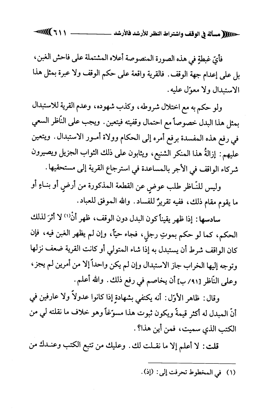 سادسها: إذا ظهر يقينًا كون البدل دون الوقف، ظهر أنْ (¬1) لا أثرَ لذلك الحكم، كما لو حكم بموتِ رجلٍ، فجاء حيًّا، وإن لم يظهر الغبن فيه، فإن كان الواقف شرط أن يستبدل به إذا شاء المتولي أو كانت القرية ضعف نزلها وتوجه إليها الخراب جاز الاستبدال وإن لم يكن واحدًا إلا من أمرين لم يجز، وعلى النّاظر أن يخاصم في رفع ذلك. والله أعلم.