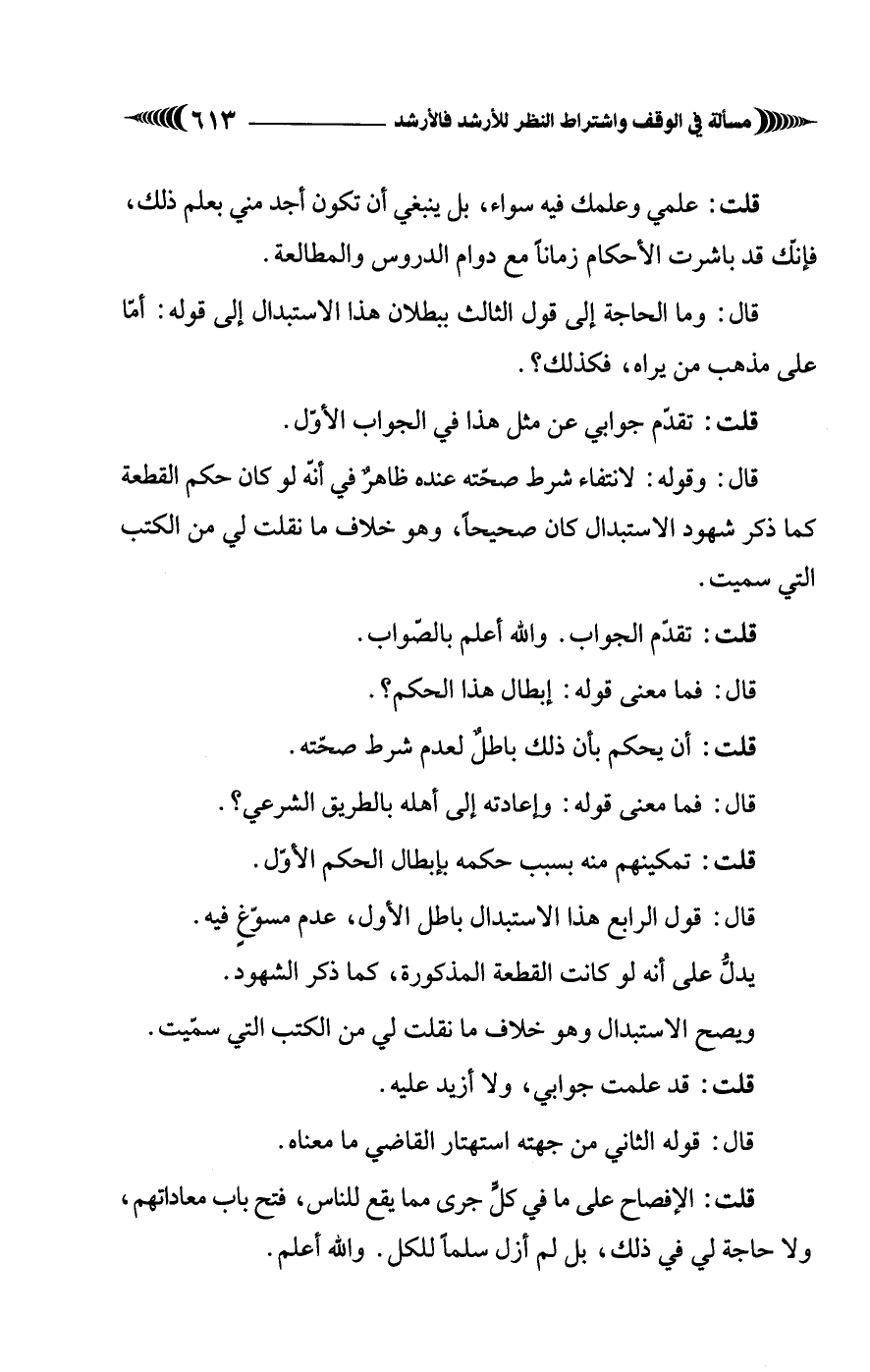قلت: علمي وعلمك فيه سواء، بل ينبغي أن تكون أجد مني بعلم ذلك، فإنّك قد باشرت الأحكام زمانًا مع دوام الدروس والمطالعة.