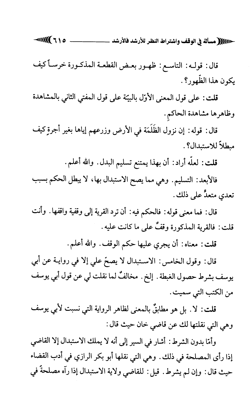قال: وقول الخامس: الاستبدال لا يصحّ علي إلا في رواية عن أبي يوسف بشرط حصول الغبطة. إلخ. مخالفٌ لما نقلت لي عن قول أبي يوسف من الكتب التي سميت.
