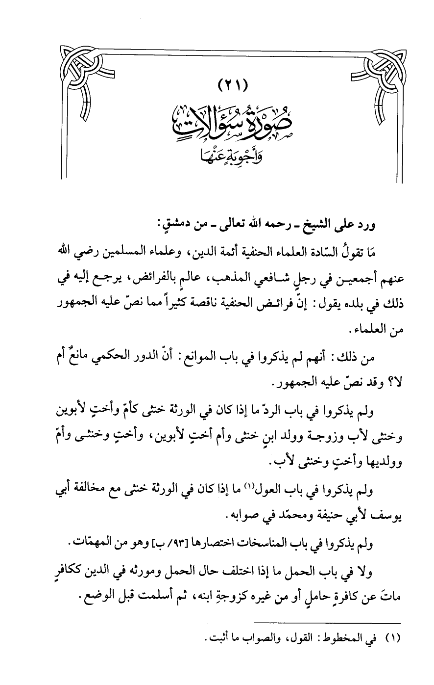 مَا تقولُ السّادة العلماء الحنفية أئمة الدين، وعلماء المسلمين رضي الله عنهم أجمعين في رجلٍ شافعي المذهب، عالمٍ بالفرائض، يرجع إليه في ذلك في بلده يقول: إنّ فرائض الحنفية ناقصة كثيرًا مما نصن عليه الجمهور من العلماء.