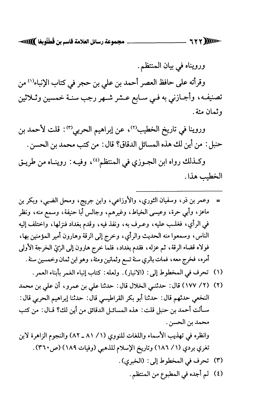 (¬1) تحرف في المخطوط إلى: (الانبار). ولعله: كتاب إنباء الغمر بأبناء العمر.