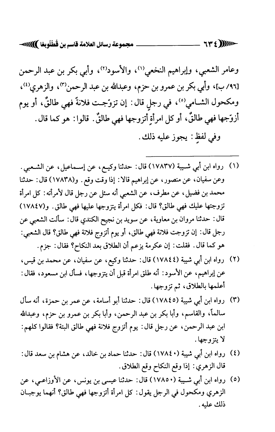 وعامر الشعبي، وإبراهيم النخعي (¬1)، والأسود (¬2)، وأبي بكر بن عبد الرحمن وأبي بكر بن عمرو بن حزم، وعبد الله بن عبد الرحمن (¬3)، والزهري (¬4)، ومكحول الشامي (¬5)، في رجلٍ قال: إن تزوّجت فلانةً فهي طالقٌ، أو يوم أزوّجها فهي طالقٌ، أو كل امرأةٍ أتزوجها فهي طالقٌ. قالوا: هو كما قال. وفي لفظٍ: يجوز عليه ذلك.
