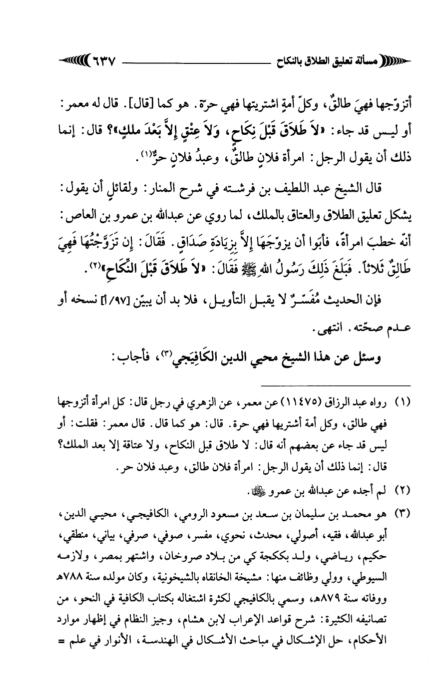 (¬3) هو محمد بن سليمان بن سعد بن مسعود الرومي، الكافيجي، محيي الدين، أبو عبدا لله، فقيه، أصولي، محدث، نحوي، مفسر، صوفي، صرفي، بياني، منطقي، حكيم، رياضي، ولد بككجة كي من بلاد صروخان، واشتهر بمصر، ولازمه السيوطي، وولي وظائف منها: مشيخة الخانقاه بالشيخونية، وكان مولده سنة 788 هـ ووفاته سنة 879 هـ، وسمي بالكافيجي لكثرة اشتغاله بكتاب الكافية في النحو، من تصانيفه الكثيرة: شرح قواعد الإعراب لابن هشام، وجيز النظام في إظهار موارد الأحكام، حل الإشكال في مباحث الأشكال في الهندسة، الأنوار في علم=