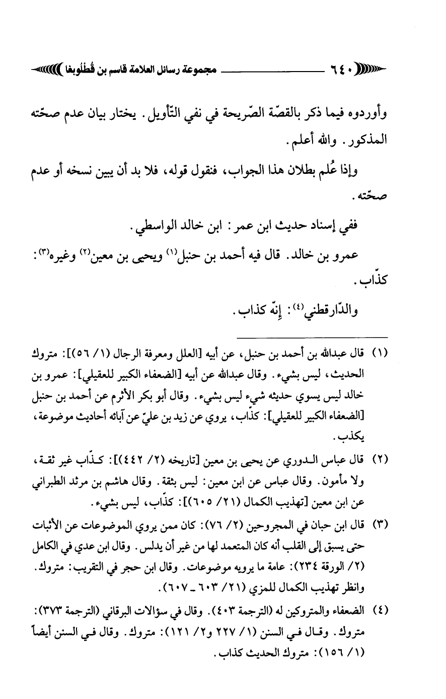 (¬1) قال عبد الله بن أحمد بن حنبل، عن أبيه [العلل ومعرفة الرجال (1/ 56)]: متروك الحديث، ليس بشيء. وقال عبد الله عن أبيه [الضعفاء الكبير للعقيلي]: عمرو بن خالد ليس يسوي حديثه شيءٍ ليس بشيء. وقال أبو بكر الأثرم عن أحمد بن حنبل [الضعفاء الكبير للعقيلي]: كذاب، يروي عن زيد بن علي عن آبائه أحاديث موضوعة، يكذب.