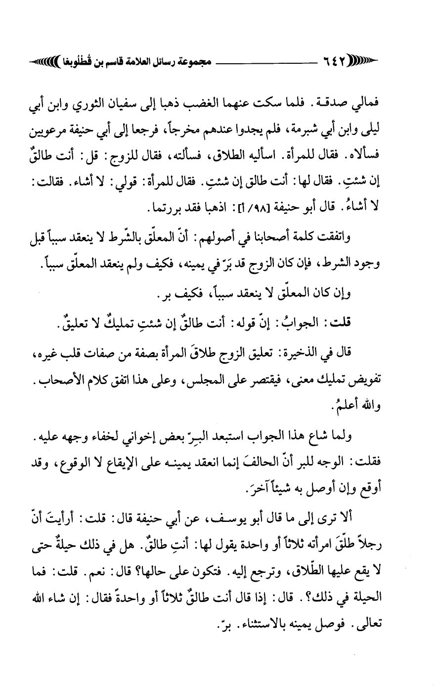 ألا ترى إلى ما قال أبو يوسف، عن أبي حنيفة قال: قلت: أرأيتَ أنّ رجلًا طلّقَ امرأته ثلاثًا أو واحدة يقول لها: أنتِ طالقٌ. هل في ذلك حيلةٌ حتى لا يقع عليها الطّلاق، وترجع إليه. فتكون على حالها؟ قال: نعم. قلت: فما الحيلة في ذلك؟. قال: إذا قال أنت طالقٌ ثلاثًا أو واحدةً فقال: إن شاء الله تعالى. فوصل يمينه بالاستثناء. برّ.