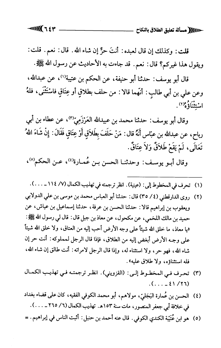 وقال أبو يوسف: حدثنا محمد بن عبيد الله العَرْزَمِيّ (¬3)، عن عطاء بن أبي رياح، عن عبد الله بن عبّاس أَنا قال: مَنْ حَلَفَ بِطَلاَقٍ أَوْ عِتَاقٍ فَقَالَ: إِنْ شَاءَ اللهُ تَعَالَى، لَمْ يَقَعْ طَلاَقٌ وَلاَ عِتَاقٌ.