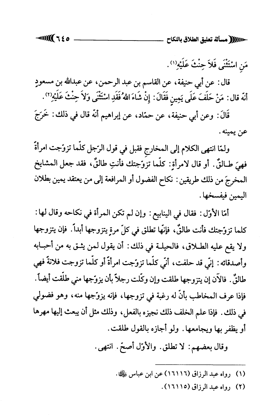 قال: عن أبي حنيفة، عن القاسم بن عبد الرحمن، عن عبد الله بن مسعودٍ أنّه قال: مَنْ حَلَفَ عَلَى يَمِينٍ فَقَالَ: إِنْ شَاءَ اللهُ فَقَدِ اسْتَثْنَى وَلاَ حِنْثَ عَلَيْهِ (¬2).