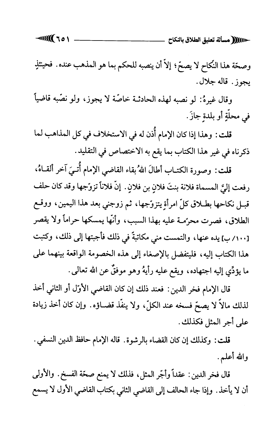 قلت: وصورة الكتاب أطالَ اللهُ بقاء القاضي الإمام أُتيَ آخر ألقاهُ، رفعت إليَّ المسماة فلانة بنتَ فلانٍ بن فلانٍ. إنّ فلاناً تزوّجها وقد كان حلف قبل نكاحها بطلاق كلّ امرأةٍ يتزوّجها، ثم زوجني بعد هذا اليمين، ووقع الطلاق، فصرت محرّمة عليه بهذا السبب، وأنّها يمسكها حراماً ولا يقصر يده عنها، والتمست مني مكاتبةً في ذلك فأجبتها إلى ذلك، وكتبت هذا الكتاب إليه، فليتفضل بالإصغاء إلى هذه الخصومة الواقعة بينهما على ما يؤدِّي إليه اجتهاده، ويقع عليه رأيهُ وهو موفقٌ عن الله تعالى.