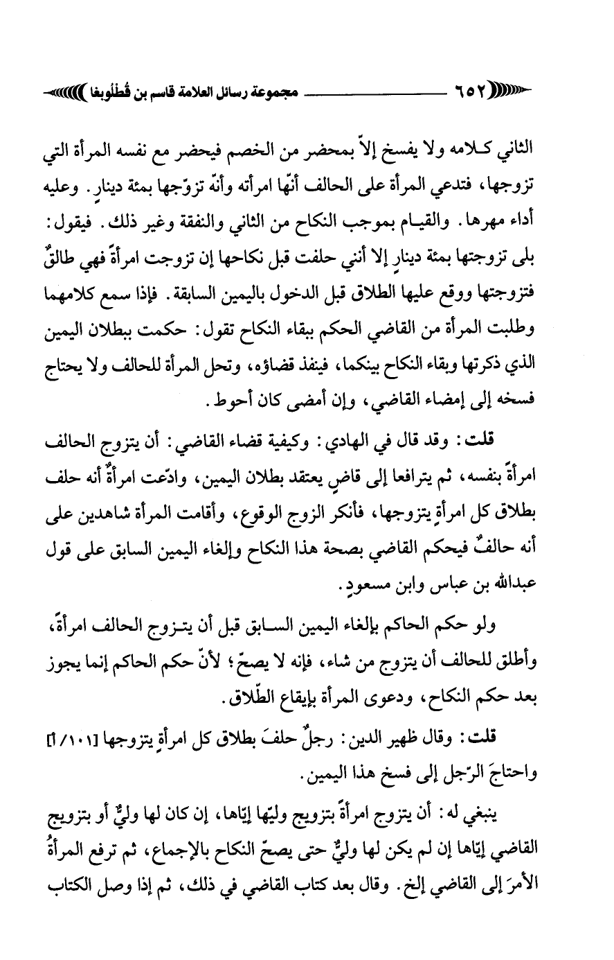 الثاني كلامه ولا يفسخ إلاّ بمحضر من الخصم فيحضر مع نفسه المرأة التي تزوجها، فتدعي المرأة على الحالف أنّها امرأته وأنَّه تزوجها بمئة دينارٍ. وعليه أداء مهرها. والقيام بموجب النكاح من الثاني والنفقة وغير ذلك. فيقول: بلى تزوجتها بمئة دينارٍ إلا أنني حلفت قبل نكاحها إن تزوجت امرأةً فهي طالقٌ فتزوجتها ووقع عليها الطلاق قبل الدخول باليمين السابقة. فإذا سمع كلامهما وطلبت المرأة من القاضي الحكم ببقاء النكاح تقول: حكمت ببطلان اليمين الذي ذكرتها وبقاء النكاح بينكما، فينفذ قضاؤه، وتحل المرأة للحالف ولا يحتاج فسخه إلى إمضاء القاضي، وإن أمضى كان أحوط.