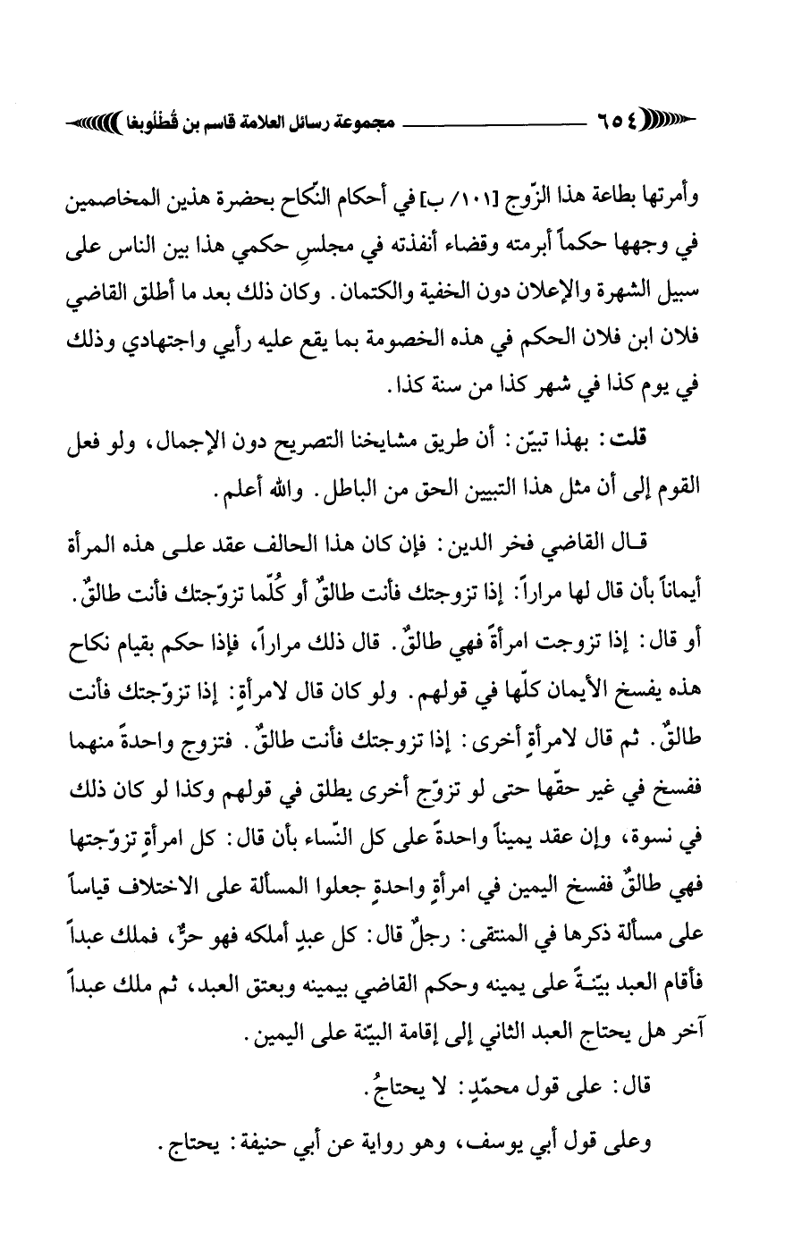 وأمرتها بطاعة هذا الزّوج في أحكام النّكاح بحضرة هذين المخاصمين في وجهها حكماً أبرمته وقضاء أنفذته في مجلسِ حكمي هذا بين الناس على سبيل الشهرة والإعلان دون الخفية والكتمان. وكان ذلك بعد ما أطلق القاضي فلان ابن فلان الحكم في هذه الخصومة بما يقع عليه رأي واجتهادي وذلك في يوم كذا في شهر كذا من سنة كذا.