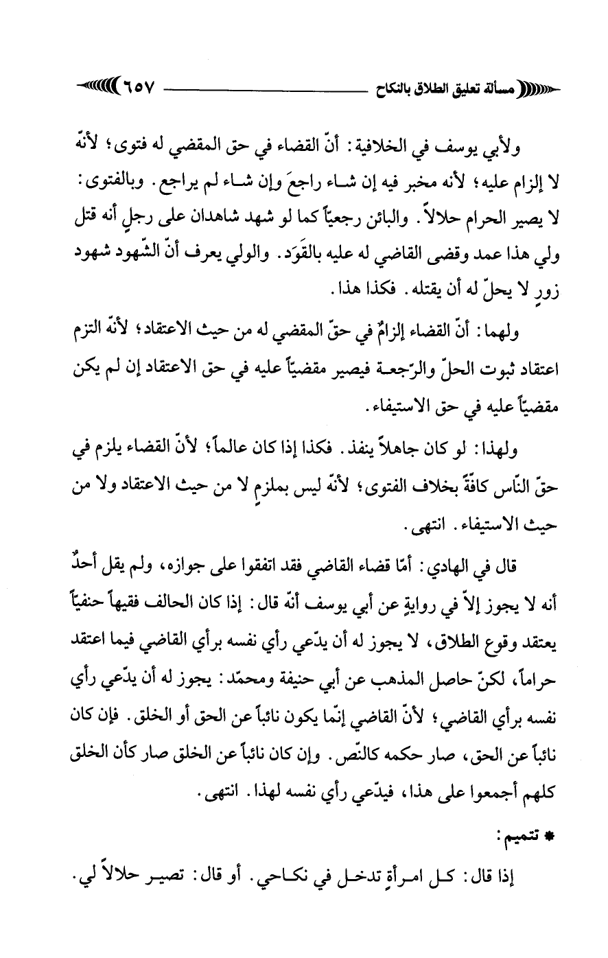 قال في الهادي: أمّا قضاء القاضي فقد اتفقوا على جوازه، ولم يقل أحدٌ أنه لا يجوز إلاّ في روايةٍ عن أبي يوسف أنّه قال: إذا كان الحالف فقيهاً حنفيأً يعتقد وقوع الطلاق، لا يجوز له أن يدعي رأي نفسه برأي القاضي فيما اعتقد حراماً، لكن حاصل المذهب عن أبي حنيفة ومحمّد: يجوز له أن يدّعي رأي نفسه برأي القاضي؛ لأن القاضي إنما يكون نائباً عن الحق أو الخلق. فإن كان نائبًا عن الحق، صار حكمه كالنَّص. وإن كان نائباً عن الخلق صار كأن الخلق كلهم أجمعوا على هذا، فيدّعي رأي نفسه لهذا. انتهى.