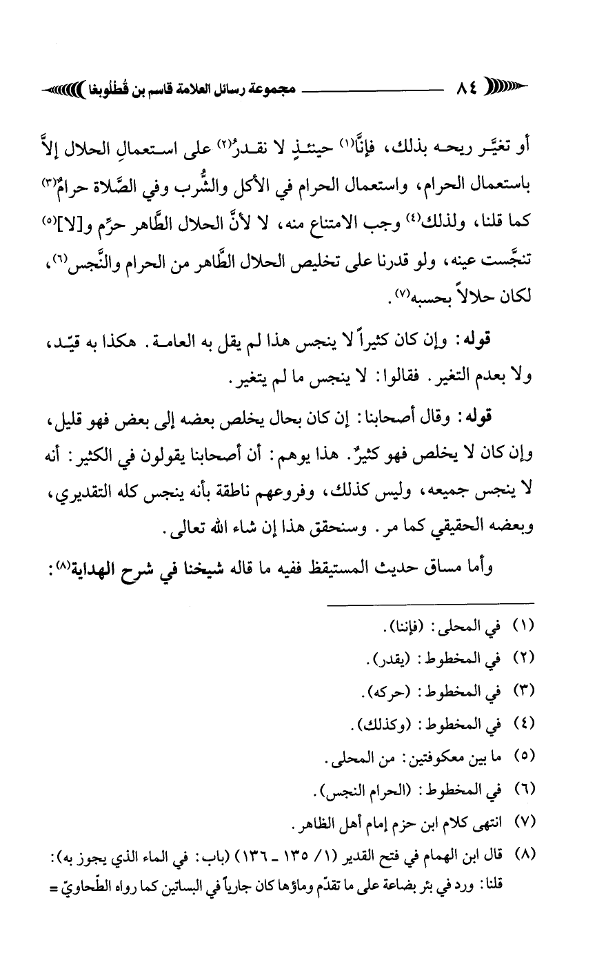 أو تغيَّر ريحه بذلك، فإنَّا (¬1) حينئذِ لا نقدرُ (¬2) على استعمالِ الحلال إلَّا باستعمال الحرام، واستعمال الحرام في الأكل والشُّرب وفي الصَّلاة حرامٌ (¬3) كما قلنا, ولذلك (¬4) وجب الامتناع منه، لا لأنَّ الحلال الطَّاهر حرِّم و [لا] (¬5) تنجَّست عينه، ولو قدرنا على تخليص الحلال الطَّاهر من الحرام والنَّجس (¬6)، لكان حلالًا بحسبه (¬7).