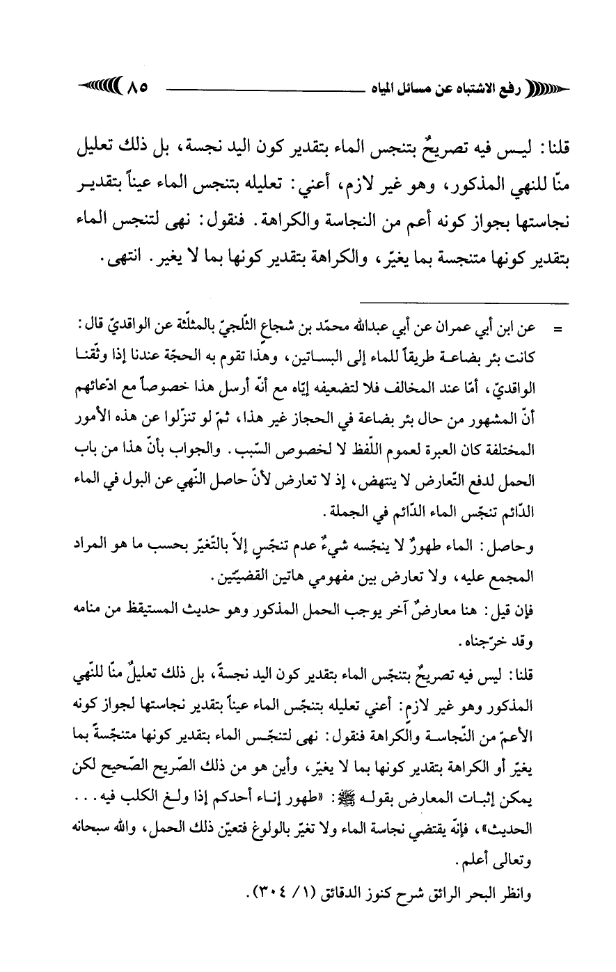 = عن ابن أبي عمران عن أبي عبد الله محمد بن شجاع الثّلجي بالمثلّثة عن الواقدي قال: كانت بئر بضاعة طريقًا للماء إلى البساتين، وهذا تقوم به الحجة عندنا إذا وثّقنا الواقديّ، أمَّا عند المخالف فلا لتضعيفه إياه مع أنّه أرسل هذا خصوصًا مع ادعائهم أن المشهور من حال بئر بضاعة في الحجاز غير هذا، ثمّ لو تنزّلوا عن هذه الأمور المختلفة كان العبرة لعموم اللفظ لا لخصوص السبب. والجواب بأن هذا من باب العمل لدفع التعارض لا ينتهض، إذ لا تعارض لأن حاصل النهي عن البول في الماء الدائم تنجس الماء الدائم في الجملة.