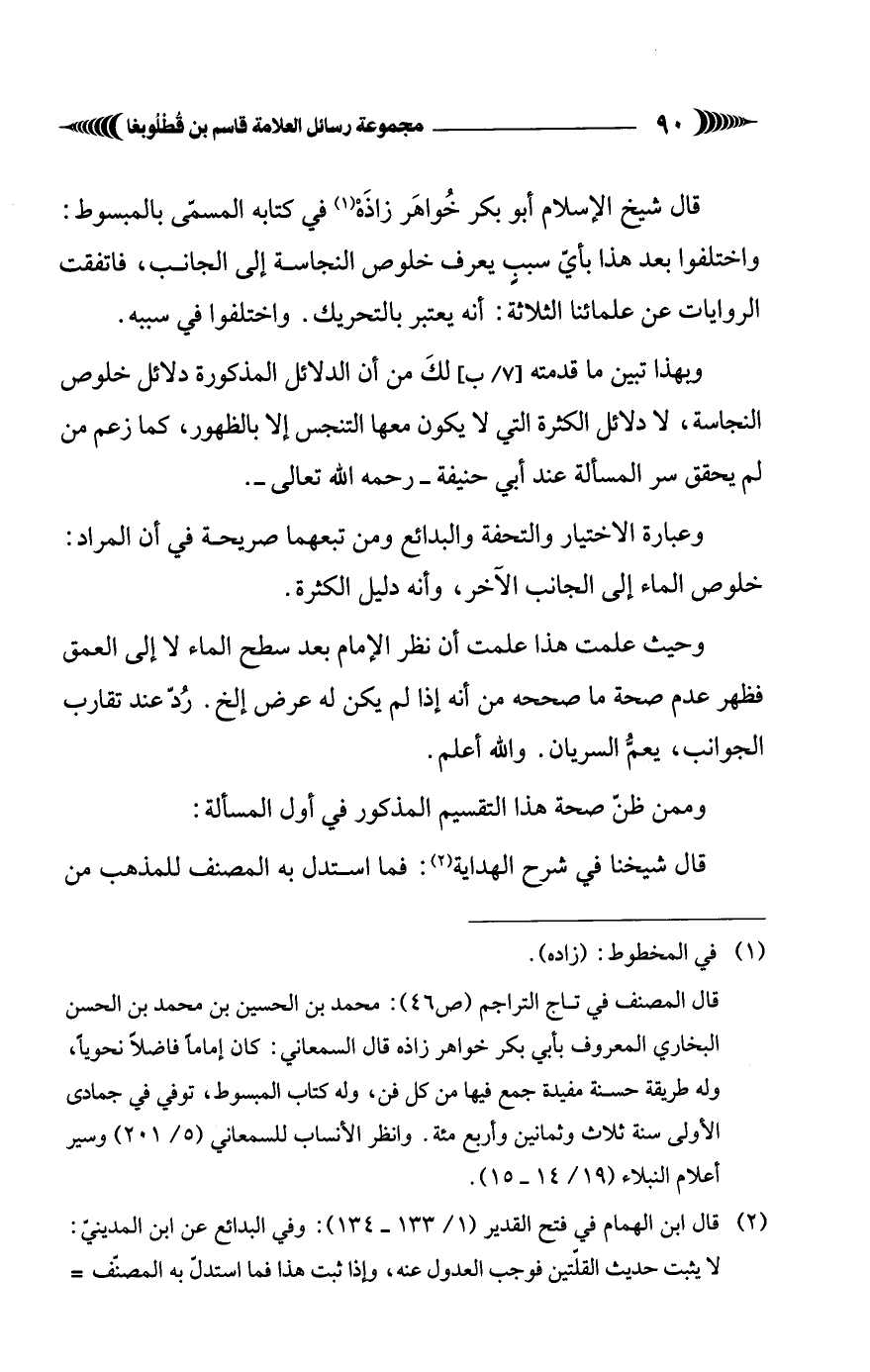 (¬2) قال ابن الهمام في فتح القدير (1/ 133 - 134): وفي البدائع عن ابن المديني: لا يثبت حديث القلتين فوجب العدول عنه، وإذا ثبت هذا فما استدل به المصنف =