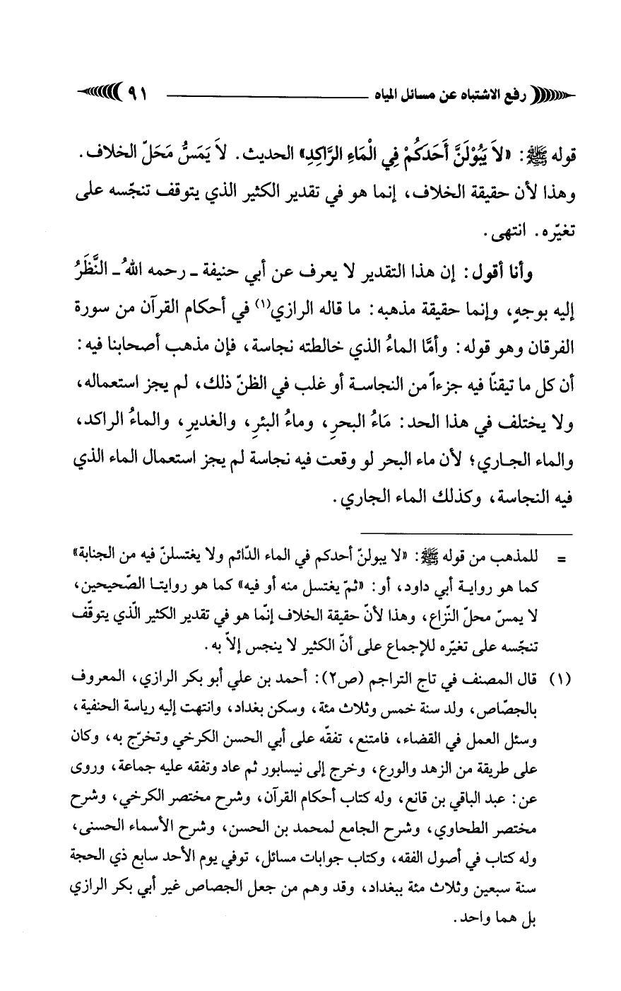 وأنا أقول: إن هذا التقدير لا يعرف عن أبي حنيفة -رحمه اللهُ- النَّظَرُ إليه بوجهٍ، وإنما حقيقة مذهبه: ما قاله الرازي (¬1) في أحكام القرآن من سورة الفرقان وهو قوله: وأمَّا الماءُ الذي خالطته نجاسة، فإن مذهب أصحابنا فيه: أن كل ما تيقنّا فيه جزءًا من النجاسة أو غلب في الظنّ ذلك، لم يجز استعماله، ولا يختلف في هذا الحد: مَاءُ البحرِ، وماءُ البئرِ، والغديرِ، والماءُ الراكد، والماء الجاري؛ لأن ماء البحر لو وقعت فيه نجاسة لم يجز استعمال الماء الذي فيه النجاسة، وكذلك الماء الجاري.