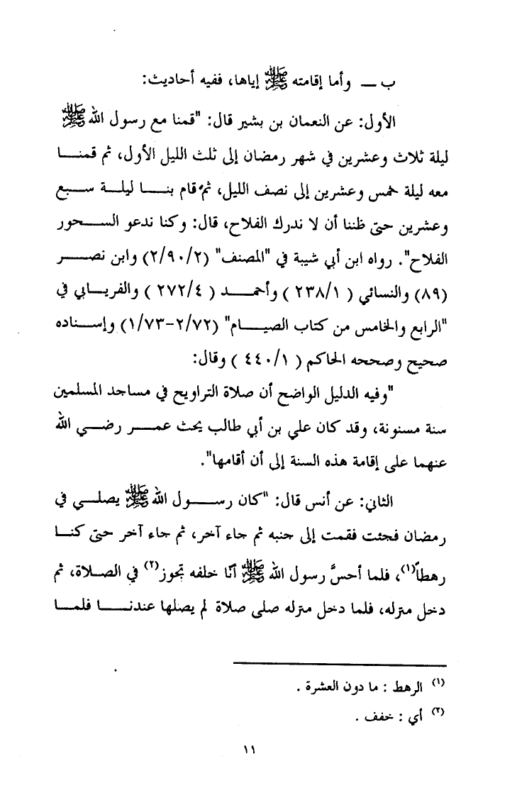 عن عائشة قالت: كان الناس يصلون في مسجد رسول الله A رمضان بالليل أوزاعا (1) يكون مع الرجل شيء من القرآن فيكون معه النفر الخمسة والستة أو أقل من ذلك أو أكثر فيصلون بصلاته فأمرني رسول الله A ليلة من ذلك أن أنصب (2) له حصيرا على باب حجرتي ففعلت فخرج إليه رسول الله A بعد أن صلى العشاء الآخرة قالت: فاجتمع إليه من في المسجد فصلى بهم رسول الله A ليلا طويلا ثم انصرف رسول الله A فدخل وترك الحصير على حاله فلما أصبح الناس تحدثوا بصلاة رسول الله A بمن كان معه في المسجد تلك الليلة (فاجتمع أكثر) منهم وأمسى المسجد راجا بالناس (3)