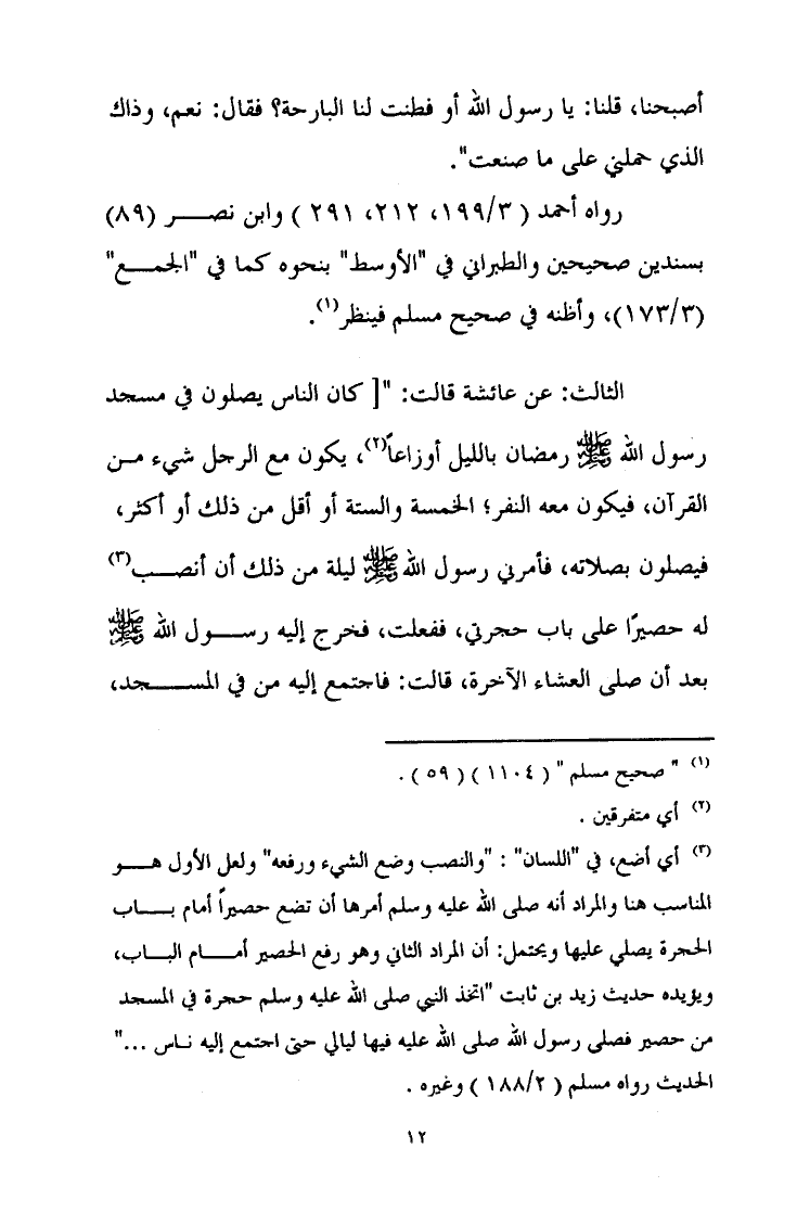 (2) أي أضع في " اللسان ": " والنصب وضع الشيء ورفعه " ولعل الأول هو المناسب هنا والمراد أنه A أمرها أن تضع حصيرا أمام الباب ويؤيده حديث زيد بن ثابت " اتخذ النبي A حجرة في المسجد من حصير فصلى رسول الله A فيها ليالي حتى اجتمع إليه ناس. . . ". الحديث رواه مسلم (2 / 188) وغيره