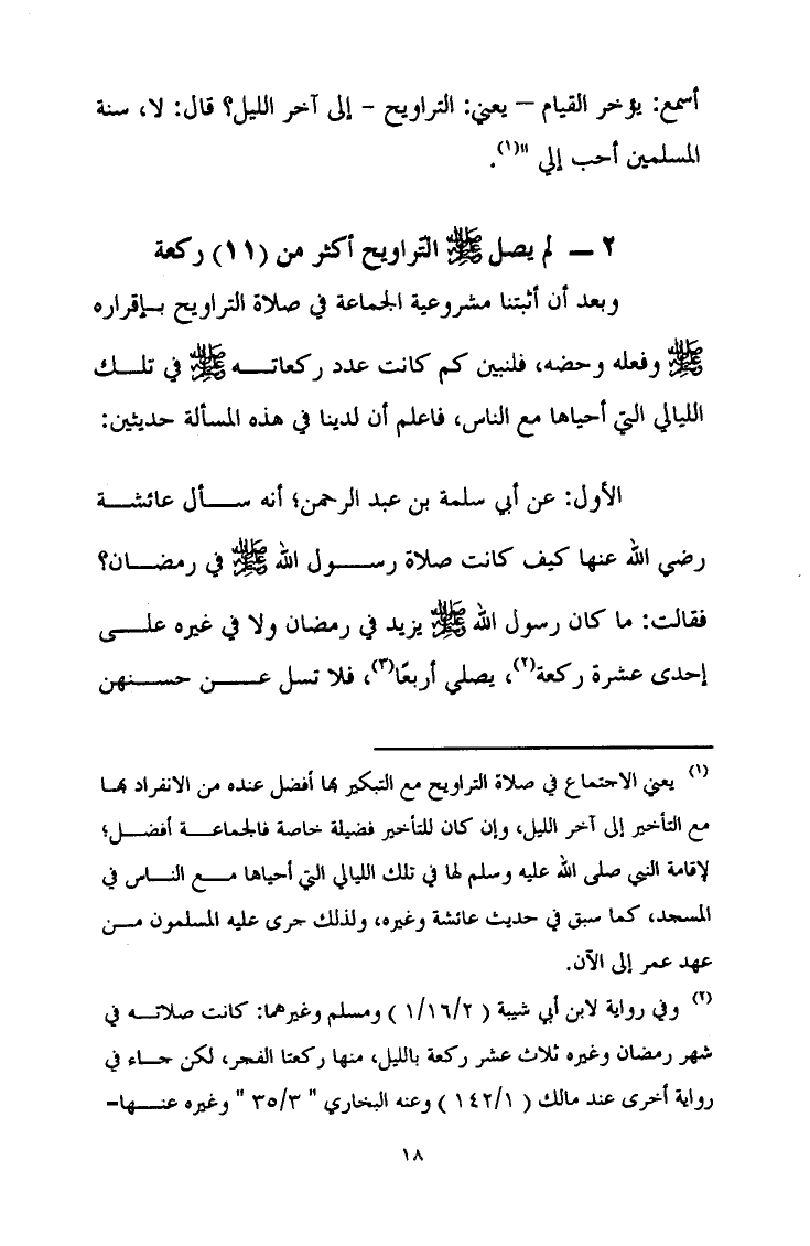 (1) يعني الاجتماع في صلاة التروايح مع التبكير بها أفضل عنده من الانفراد بها مع التأخير إلى آخر الليل وإن كان للتأخير فضيلة خاصة فالجماعة أفضل لإقامة النبي A لها في تلك الليالي التي أحياها مع الناس في المسجد كما سبق في حديث عائشة وغيره ولذلك جرى عليه المسلمون من عهد عمر إلى الآن