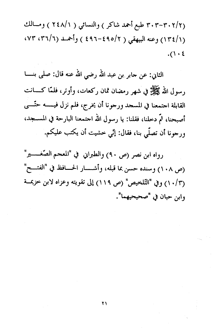 عن جابر بن عبد الله Bهـ قال: صلى بنا رسول الله A في شهر رمضان ثمان ركعات وأوتر فلما كانت القابلة اجتمعنا في المسجد ورجونا أن يخرج فلم نزل فيه حتى أصبحنا ثم دخلنا فقلنا يا رسول الله اجتمعنا البارحة في المسجد ورجونا أن تصلي بنا فقال: