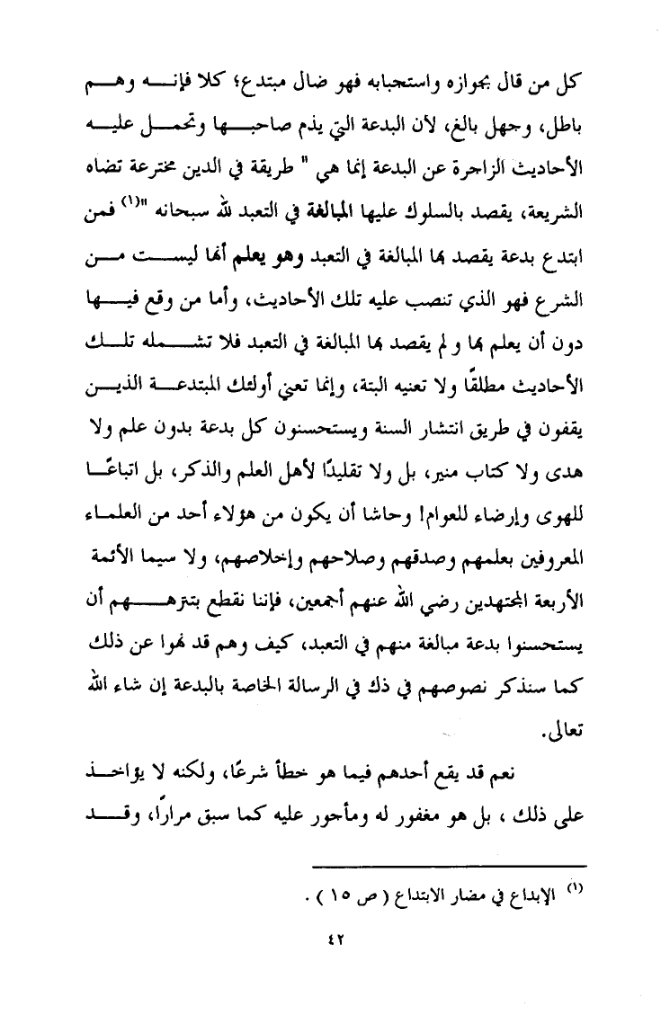 كل من قال بجوازه واستحبابه فهو ضال مبتدع كلا فإنه وهم باطل وجهل بالغ لأن البدعة التي يذم صاحبها وتحمل عليه الأحاديث الزاجرة عن البدعة إنما هي " طريقة في الدين مخترعة تضاه الشيعة يقصد بالسلوك عليها المبالغة في التعبد لله سبحانه " فمن ابتدع بدعة يقصد بها المبالغة في التعبد وهو يعلم أنها ليست من الشرع فهو الذي تنصب عليه تلك لأحاديث وأما من وقع فيها دون أن يعلم بها ولم يقصد بها المبالغة في التعبد فلا تشمله تلك الأحاديث مطلقا ولا تعنيه البتة وإنما تعني أولئك المبتدعة الذي يقفون في طريق انتشار السنة ويستحسنون كل بدعة بدون علم ولا هدى ولا كتاب منير بل ولا تقليدا لأهل العلم والذكر بل اتباعا للهوى وإرضاء للعوام وحاشا أن يكون من هؤلاء أحد من العلماء المعروفين بعلمهم وصدقهم وصلاحهم وإخلاصهم ولا سيما الأئمة الأربعة المجتهدين Bهم أجمعين فغننا نقطع بتنزههم أن يستحسنوا بدعة مبالغة منهم في التعبد كيف وهم قد نهوا عن ذلك كما سنذكر نصوصهم في ذلك في الرسالة الخاصة بالبدعة إن شاء الله تعالى