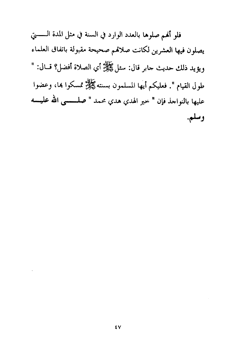 فلو أنهم صلوها بالعدد الوارد في السنة في مثل المدة التي يصلون فيها العشرين لكانت صلاتهم صحيحة مقبولة باتفاق العلماء ويؤيد ذلك حديث جابر قال: سئل A أي الصلاة أفضل؟ قال: " طول القيام ". فعليكم أيها المسلمون بسنته A تمسكوا بها وعضوا عليها بالنواجذ فإن " خير الهدى هدي محمد " A
