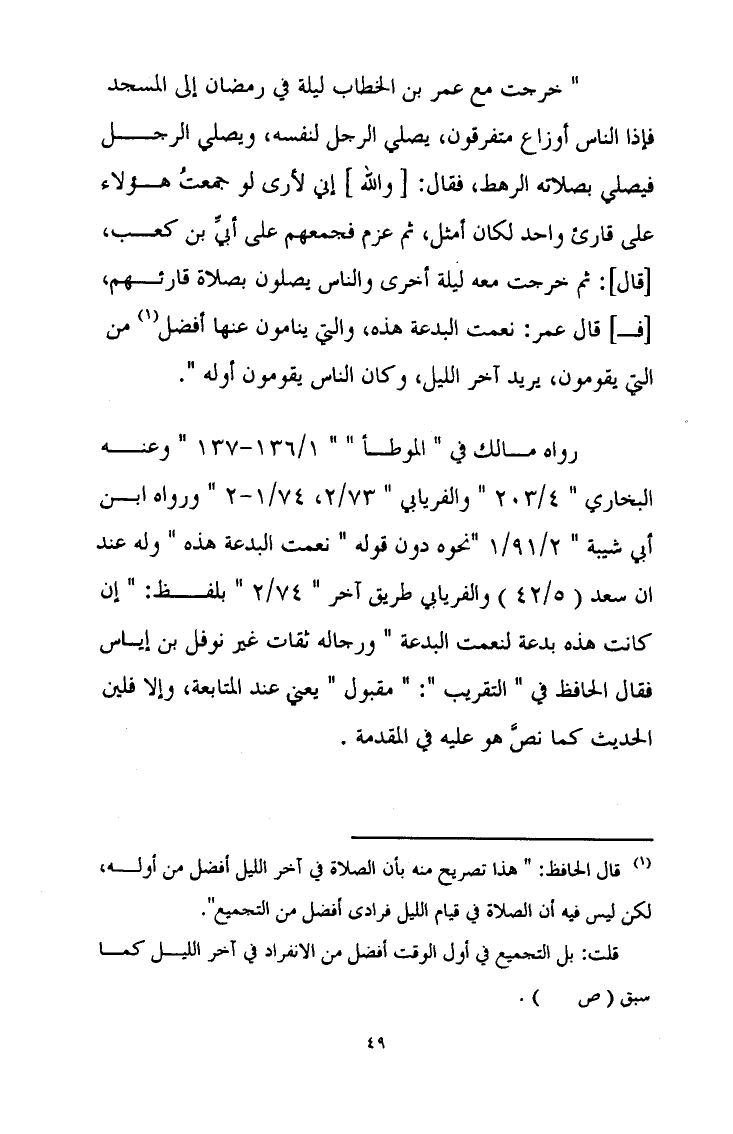 رواه مالك في الموطأ وعنه البخاري والفرياني ورواه ابن أبي شيبة نحوه دون قوله نعمت البدعة هذه وله عند ابن سعد والفريابي طريق آخر بلفظ: " ان كانت هذه لنعمت البدعة " ورجاله ثقات غير نوفل بن إياس فقال الحافظ في " التقريب ": " مقبول " عند المتابعة والا فلين الحديث]