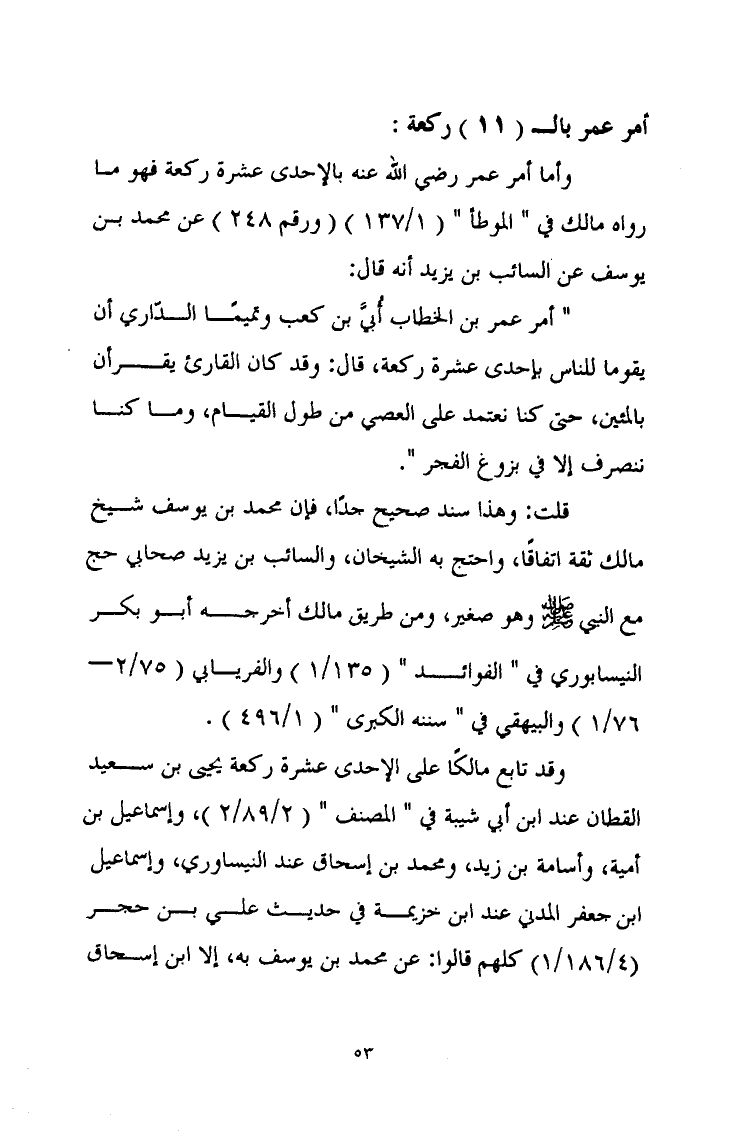 وأما أمر عمر Bهـ بالإحدى عشرة ركعة فهو ما رواه مالك في " الموطأ " (1 / 137) (ورقم 248) عن محمد بن يوسف عن السائب بن ييد أنه قال: