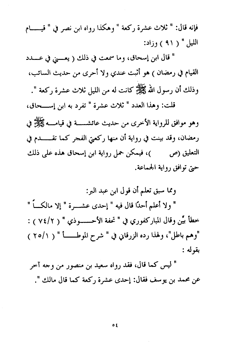 قلت: وهذا العدد: " لاث عشة " ترد به ابن إسحاق وهو موافق للرواية الأخرى من حديث عائشة في قيامه A في رمضان وقد بينت في رواية أن منها ركعتي الفجر فيمكن حمل رواية ابن إسحاق هذه على ذلك حتى توافق رواية الجماعة