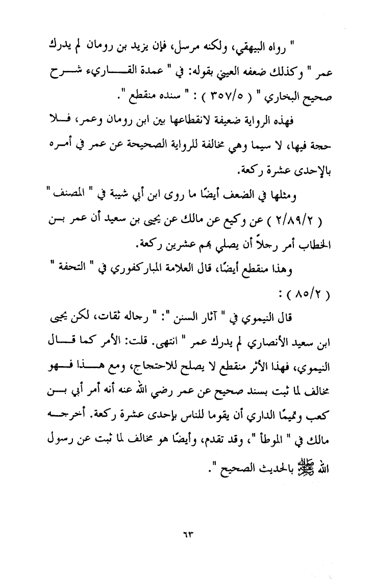 قال النيموي في " آثار السنن ": " رجاله ثقات لكن يحيى ابن سعيد الأنصاري لم يدرك عمر " انتهى. قلت: الأمر كما قالك النيموي فهذا الأثر منقطع لا يصلح للاحتجاج ومع هذا فهو مخالف لما ثبت بسند صحيح عن عمر Bهـ أنه أمر أبي بن كعب وتميما الداري أن يقوما للناس بإحدى عشرة ركعة. أخرجه مالك في " الموطأ " وقد تقدم وأيضا هو مخالف لما ثبت عن رسول الله A بالحديث الصحيح "