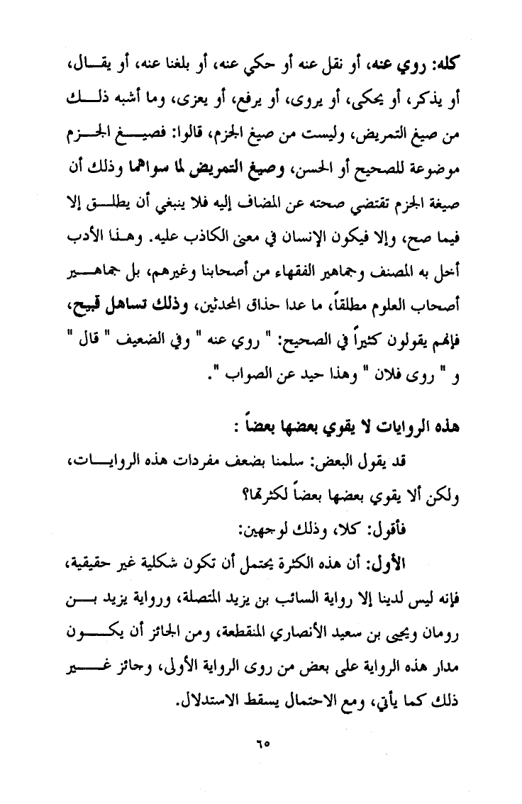 كله: روي عنه أو نقل عنه أو حكي عنه أو بلغنا عنه أو يقال أو يذكر أو يحكى أو يروى أو يرفع أو يعزى وما أشبه ذلك من صيغ التمريذ وليست من صيغ الجزم قالو: فصيغ الجزم موضوعة للصحيح أو الحسن وصيغ التمريض لما سواهما وذلك أن صيغة الجزم تتضي صحته عن المضاف إليه فلا ينبغي أن يطلق إلا فيما صح وإلا فيكون الإنسان في معنى الكاذب عليه. وهذا الأدب أخل به المصنف وجماهير الفقهاء من أصحابنا وغيرهم بل جماهير أصحاب العلوم مطلقا ما عدا حذاق المحدثين وذلك تساهل قبيح فإنهم يقولون كثيرا في الصحيح:
