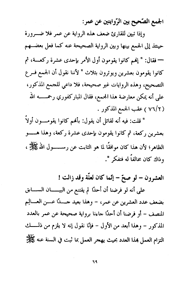 وإذا تبين للقاريء شعف هذه الرواية عن عمر فلا ضرورة حينئذ إلى الجمع بينها وبين الرواية الصحيحة عنه كما فعل بعضهم - فقال: " إنهم كانوا يقومون أول الأمر بإحدى عشرة ركعة ثم كانوا يقومون بعشرين ويوترين بثلاث " لأننا نقول أن الجمع فرع التصحيح وهذه الروايات غير صحيحة فلا داعي للجمع المذكور على انه يمكن معارضة هذا الجمع فقال المباركفوري C (2 / 76) عقب الجمع المذكور