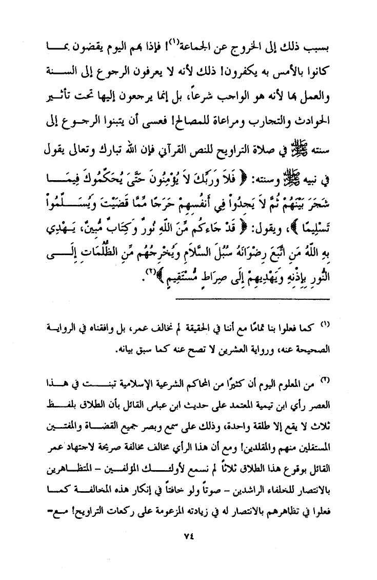 بسبب ذلك إلى الخروج عن الجماعة فإذا بهم اليوم يقضون بما كانوا بالأمس به يكفرون ذلك لأنه لا يعرفون الرجوع إلى السنة والعمل بها لأنه هو الواجب شرعا بل إنما يرجعون إليها تحت تأثير الحوادث والتجارب ومراعاة للمصالح فعسى أن يتبنوا الرجع إلى السنة والعمل بها لأنه هو الواجب شرعا بل إنما يرجعون إليها تحت تأثير الحوادث والتجارب ومراعاة للمصالح فعسى أن يتبنوا الرجوع إلى سنته A في صلاة التراويح للنص القرآني فإن الله تبارك وتعالى يقول في نبيه A وسننه:؟ فلا وربك لا يؤمنون حتى يحكموك فيما شجر بينهم ثم لا يجدوا في أنفسهم حرجا مما قضيت ويسلموا تسليما؟ ويقول:؟ قد جاءكم من الله نور وكتاب مبين يهدي به الله من اتبع رضوانه سبل السلام ويخرجهم من الظلمات إلى النور بإذنه ويهديهم إلى صراط مستقيم؟