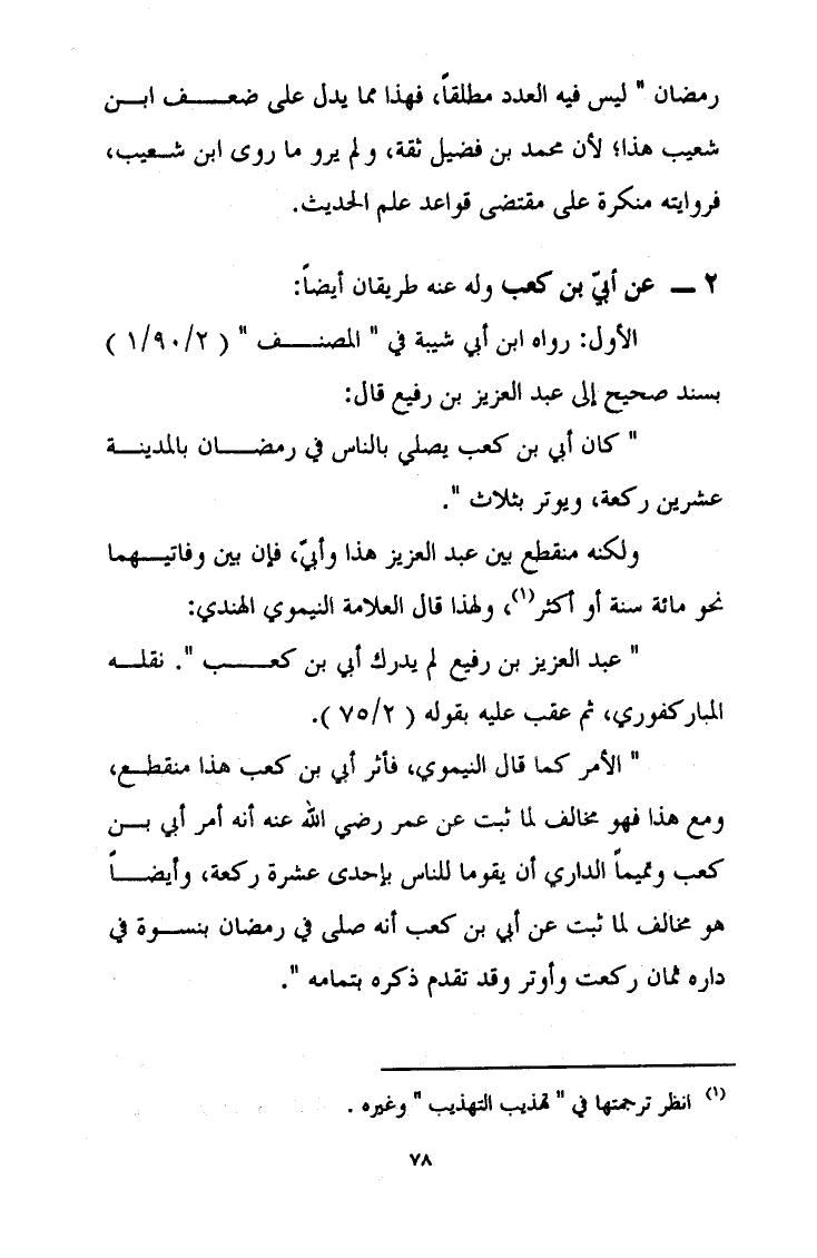 الاول: [كان أبي بن كعب يصلي بالناس في رمضان بالمدينة عشرين ركعة ويوتر بثلاث رواه ابن أبي شيبة في المصنف بسند صحيح إلى عبد العزيز بن رفيع ولكنه منقطع بين عبد العزيز هذا وأبي فان بين وفاتهما نحو مائة سنة أو أكثر ولهذا قال العلامة النيموي الهندي: