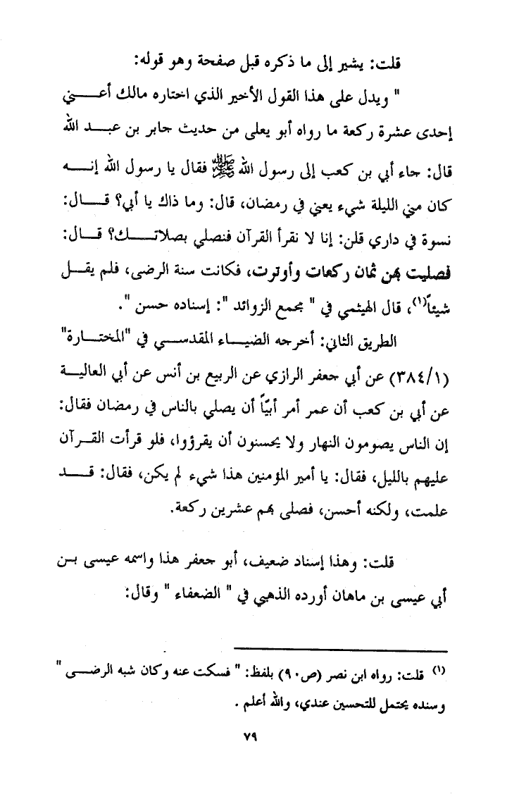 ويدل على هذا اقل الأخير الذي اختاره مالك أعني إحدى عشرة ركعة ما رواه أبو يعلى من حديث جابر بن عبد الله قال: اء أبي بن كعب إلى رسول الله A فقال يا رسول الله إنه كان مني الليلة شيء يعني في رمضان قال: وما ذاك يا أبي؟ قال: نسوة في داري قلن: إنا لا نقرأ القرآن فنصلي بصلاتك؟ قال: فصليت بهن ثمان ركعات وأوترت فكانت سنة الرضى فلميقل شيئا قال الهيثمي في