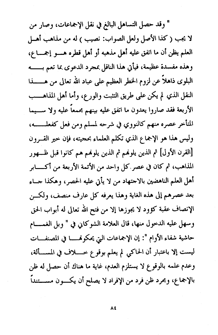 " وقد حصل التساهل البالغ في نقل الإجماعات وصار من لا يجب (كذا الأصل ولعل الصواب: نصيب) له من مذاهب أهل العلم ين أن ما اتفق عليه أهل مذهبه أو أهل قطره هو إجماع وهذه مفسدة عظيمة فيأتي هذا الناقل بمجرد الدعوى بما تعم به البلوى ذاهلا عن لزوم الخطر العظيم على عباد الله تعالى من هذا النقل الذي لم يكن على طريق التثبتوالورع وأما أهل المذاهب الأربعة فقد صاروا يعدون ما اتفق عليهم بينهم مجمعاص عليه ولا سيما المتأخر عصره منهم كالنووي في شرحه مسلم من فعل كفعله وليس هذا هو الإجماع الذي تكلم العلماء بحجيته فإن خير القرون [القرن الأول] ثم الذين يلونهم ثم الذين يلونهم هم كانوا قبل ظهور المذاهب ثم كان في عصر كل واحد من الائمة الأربعة نم أكابر أهل العلم الناهضين بالاجتهاد من لا يأتي عليه الحصر وهكذا جاء بعد عصرهم إلى هذه الغاية وهذا يعرفه كل عارف منصف ولكن الإنصاف عقبة كؤود لا يجوزها إلا من فتح الله تعالى به أبواب الحق وسهل عليه الدخول منها قال العلامة الشوكاني في " وبل الغمام حاشية شفاء الأوام ": إن الإجماعات التي يحكونها في المصنفات ليست إلا باعتبار أن الحاكي لم يعلم بوقوع خلاف في المسألة وعدم علمه بالوقوع لا يستلزم العدم غاية ما هناك أن حصل له ظن بالإجماع ومجرد ظن فرد من الإفراد لا يصلح أن يكون مستندا