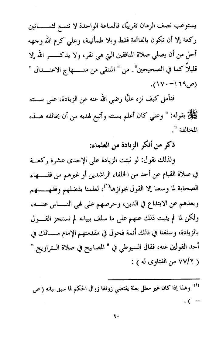 يستوعب نصف الزمان تقريبا فالساعة الواحدة لا تتسع لثمانين ركعة إلا أن تكون بالفاتحة فقط وبلا طمأنينة وعلي كرم الله وجهه أجل من أن يصلي صلاة المنافقين التي هي نقر ولا يذكر الله إلا قليلا كما في الصحيحن ". من " المنتقى من منهاج الاعتدال " (ص 169 - 170)