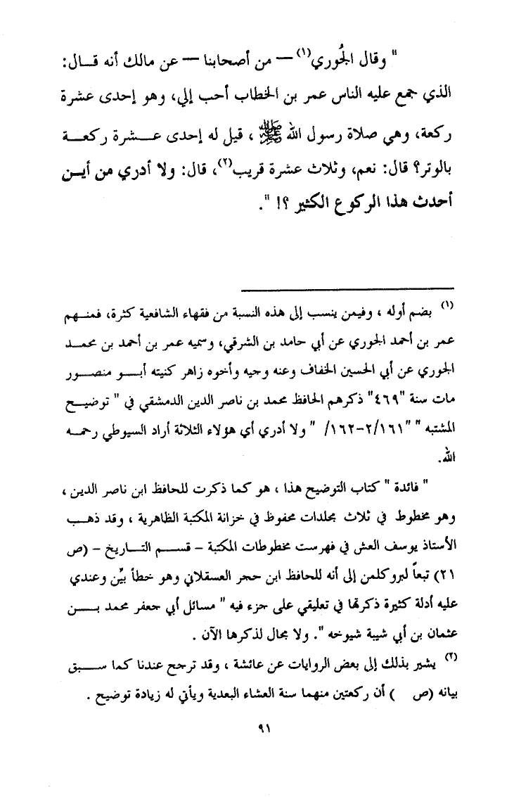 " وقال الجوري - من أصحابنا - عن مالك أنه قال: الذي جمع عليه الناس عمر بن الخطاب أحب إلي وهو إحدى عشرة ركعة وهي صلاة رسول الله A قيل له إحدى عشرة ركعة بالوتر؟ قال: نعم وثلاث عشرة قريب قال: ولا أدري من أين أحدث هذا الركوع الكثير؟ "