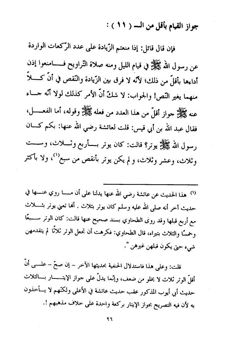 فإن قال قائل: إذا منعتم الزيادة على عدد الركعات الواردة عن رسول الله A في قيام الليل ومنه صلاة التراويح فامنعوا إذن أداءها بأقل من ذلك لأ هـ لا فرق بين الزيدة والنقص في أن كلا منهما يغير النص والجواب: لا شك أن الأمر كذلك لولا أنه جاء عنه A جواز أقل من هذا العدد من فعله A وقوله أما الفعل فقال عبد الله بن أبي قيس: قلت لعائشة Bها: بكم كان رسول الله A يوتر؟ قلات: كان يوتر بأربع وثلاث وست وثلاث وعشر وثلاث ولم يكن يؤثر بأنقص ن سبع ولا بأكثر