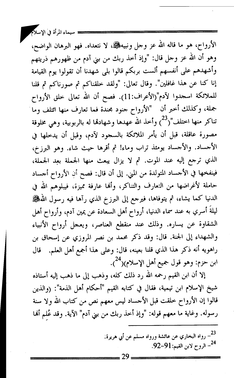 إلا أن ابن القيم رحمه الله رد ذلك كله، وذهب إلى ما ذهب إليه أستاذه شيخ الإسلام ابن تيمية، فقال في كتابه القيم "أحكام أهل الذمة": (والذين قالوا إن الأرواح خلقت قبل الأجساد ليس معهم نص من كتاب الله ولا سنة رسوله. وغاية ما معهم قوله: "وإذ أخذ ربك من بني آدم" الآية. وقد عُلِم أنها